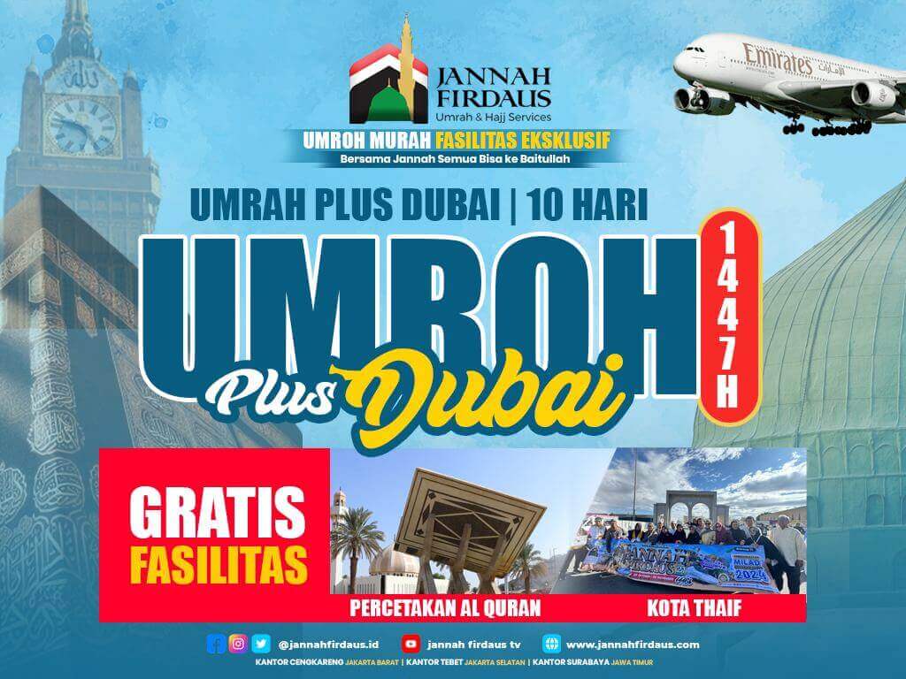 Paket Umroh Plus Dubai 1447 H dari Jannah Firdaus Tour & Travel adalah pilihan terbaik untuk jamaah yang ingin merasakan pengalaman ibadah sekaligus wisata modern. Perpaduan kekhusyukan di Tanah Suci dengan pesona Dubai akan menjadi momen tak terlupakan bersama keluarga.