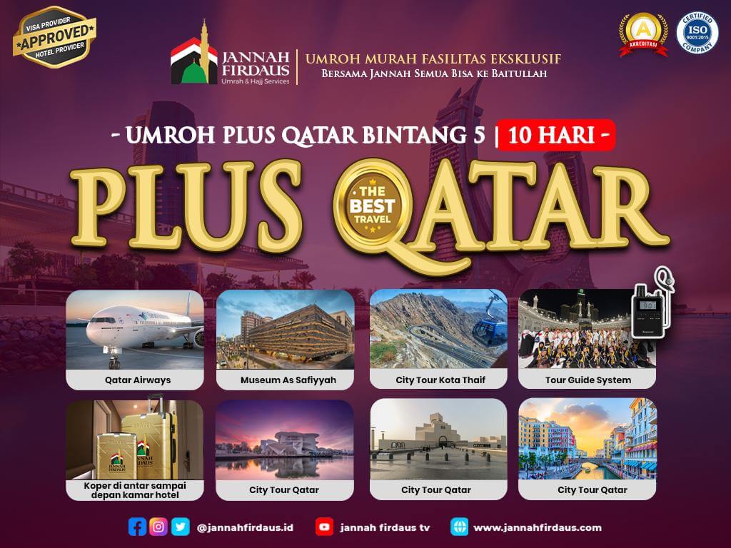 Harga paket umroh plus Qatar murah ini sudah termasuk tiket pesawat pp keberangkatan Jakarta (CGK), hotel bintang 3 , konsumsi 3x sehari, transportasi, perlengkapan umroh, city tour Qatar, serta bimbingan ibadah dari muthawif berpengalaman, dengan umroh plus Qatar bersama Jannah Firdaus bukan sebagai perjalanan biasa, melainkan akan mendapatkan perjalanan ibadah dan ilmu yang akan didapatkan oleh seluruh jamaah.