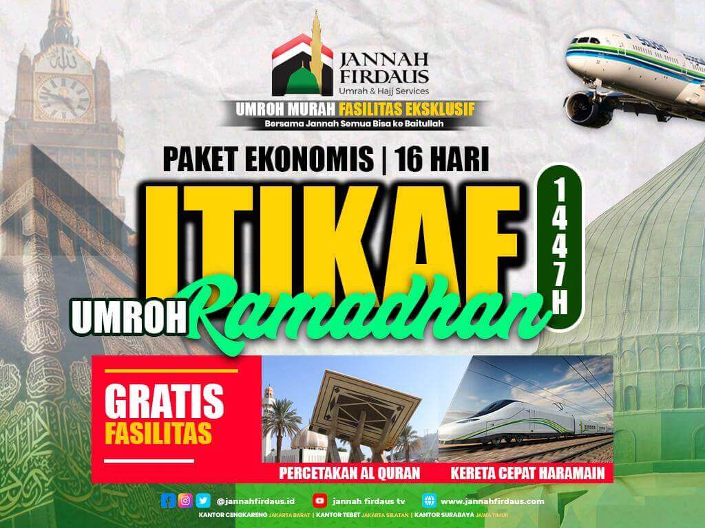 Jangan lewatkan kesempatan meraih keberkahan Itikaf Ramadhan Ekonomis 1447 H bersama PT Jannah Firdaus Tour & Travel. Program ini adalah pilihan tepat bagi Anda yang ingin memperbanyak amal di bulan suci dengan ibadah yang lebih terarah, nyaman, dan penuh makna.