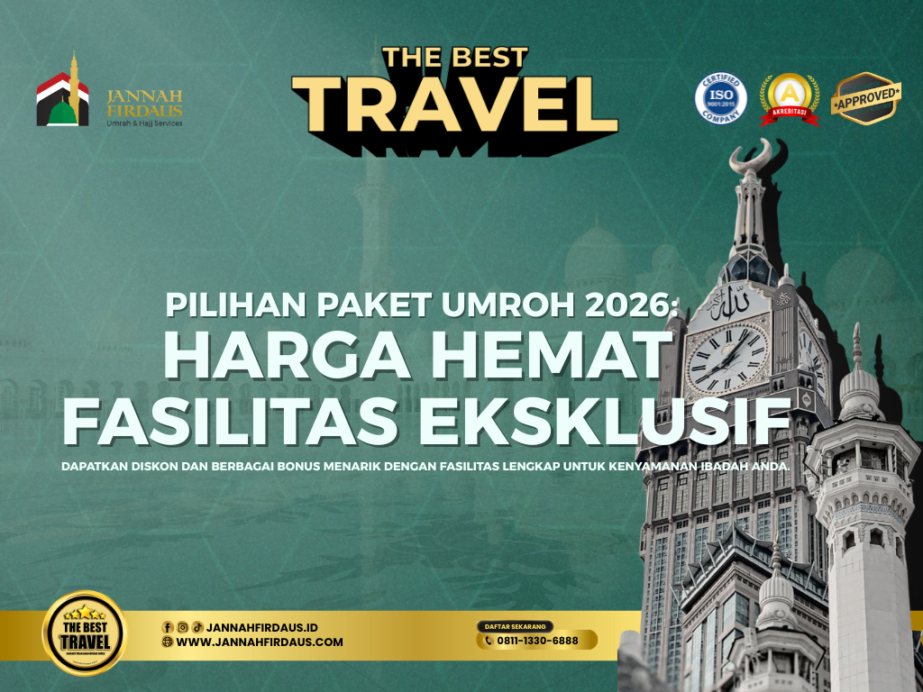 Bagi sahabat yang tengah merencanakan umroh di tahun 2026, Jannah Firdaus Tour & Travel siap menjadi mitra perjalanan ibadah yang aman, nyaman, dan terpercaya. Didukung pengalaman memberangkatkan banyak jamaah, fasilitas lengkap, bonus menarik, serta pilihan program yang fleksibel, Jannah Firdaus Tour & Travel berkomitmen menghadirkan layanan terbaik demi ibadah yang tenang dan penuh keberkahan.
