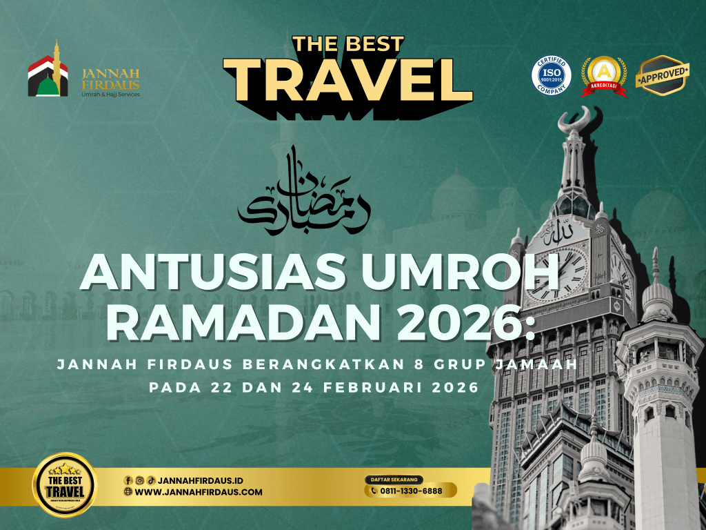 Bagi sahabat yang tengah merencanakan umroh di tahun 2026, Jannah Firdaus Tour & Travel siap menjadi mitra perjalanan ibadah yang aman, nyaman, dan terpercaya. Didukung pengalaman memberangkatkan banyak jamaah, fasilitas lengkap, bonus menarik, serta pilihan program yang fleksibel, Jannah Firdaus Tour & Travel berkomitmen menghadirkan layanan terbaik demi ibadah yang tenang dan penuh keberkahan.